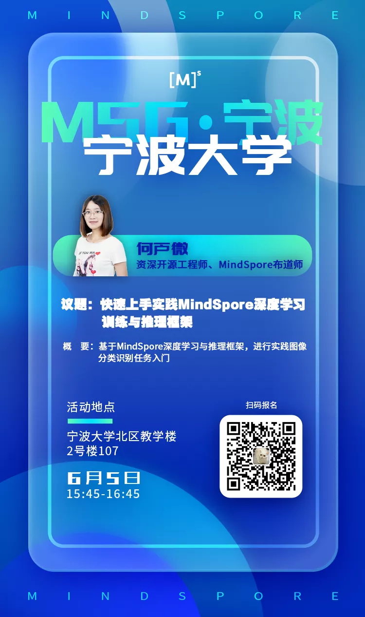 本周六(6月5日),MSG·宁波我们将邀请华为资深开源工程师、MindSpore布道师——何芦微,与大家面对面的交流与分享如何快速上手实践MindSpore深度学习训练与训练推理框架,并带领大家进行图像识别分类任务实践!