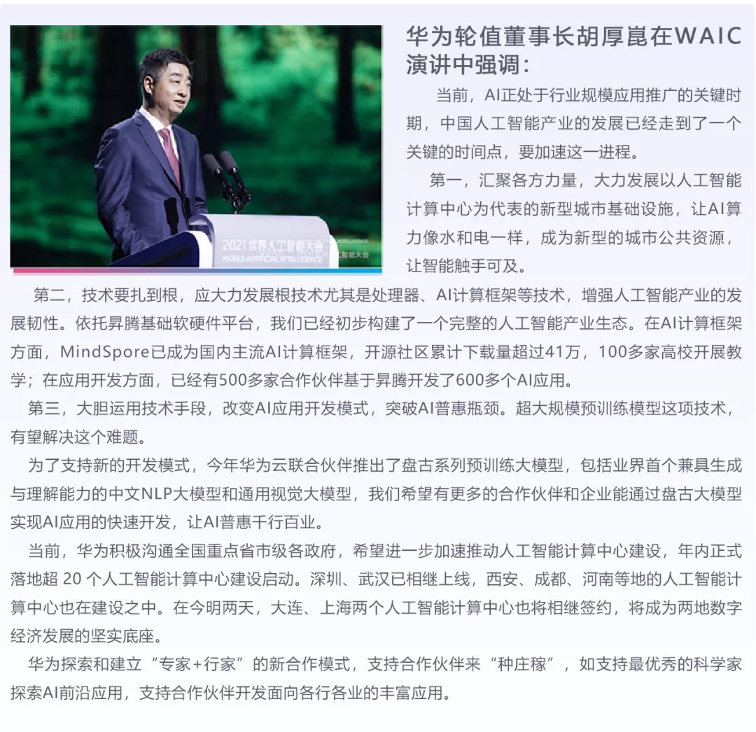 在7月8日至10日,第四届世界人工智能大会(WAIC)期间,华为轮值董事长胡厚崑、华为昇腾业务总裁许映童以及中国科学院院士龚健雅、中国工程院院士郑纬民、中科院自动化所所长徐波等行业领袖积极参与并发表主题演讲。