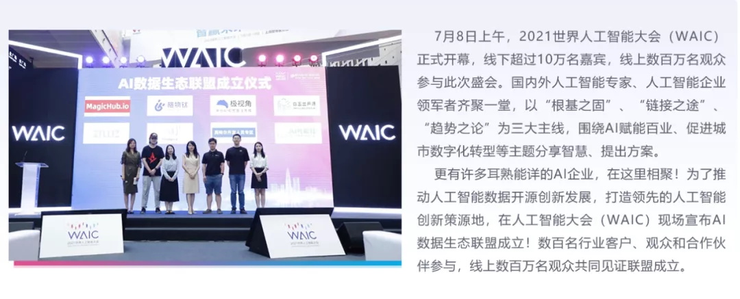 7月10日下午,2021年世界人工智能大会(WAIC)圆满落幕。MindSpore社区在开幕式现场宣布AI数据生态联盟成立!数百名行业客户、观众和合作伙伴参与,线上数百万名观众共同见证联盟成立。未来,AI数据生态联盟将凝聚行业共识,推广开源理念,打造开源社区,主动开源数据,对AI为代表的行业数据进行资源的整合与优化,打造服务于所有开发者的优质开源生态。