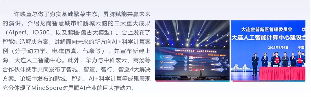 胡厚崑总发表了主题为“根深叶茂,共筑人工智能新生态”的演讲。胡总表示,大力发展以人工智能计算中心为代表的新型城市基础设施,分工协作建立多方合作共同繁荣人工智能产业新生态。在AI计算框架方面,MindSpore已成为国内主流AI计算框架,开源社区累计下载量超过41万,在100多所高校开展教学;胡总还提到当前AI普惠的瓶颈是开发效率太低,要用超大规模的预训练模型解决这个难题,盘古系列预训练大模型实现AI应用的快速开发,让AI普惠千行百业。