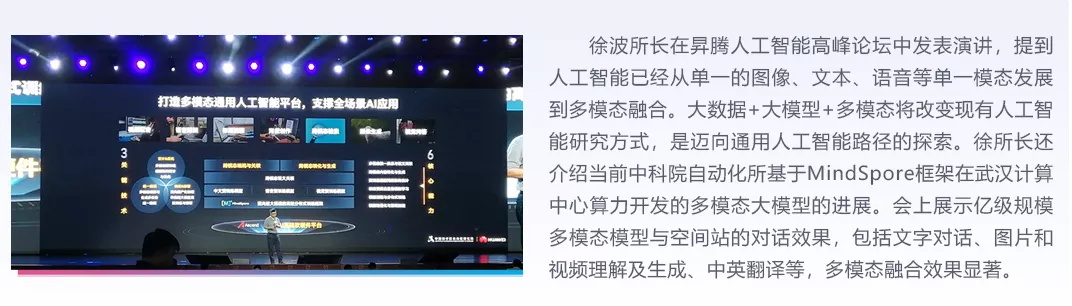 中科院自动化所徐波所长介绍当前基于MindSpore框架在武汉计算中心开发的多模态大模型,展示了亿级规模多模态模型与空间站的对话效果,包括文字对话、图片、视频理解及生成、中英翻译等,多模态融合效果显著。