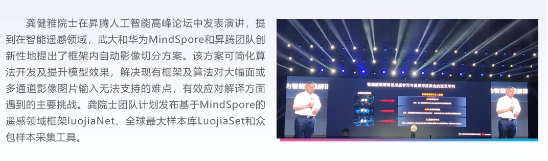 中国科学院院士龚健雅分享了智能遥感解译的研究进展与挑战,武大和华为创新提出在框架内自动实现影像的切分方案,并计划发布基于MindSpore的遥感领域框架luojiaNet。
