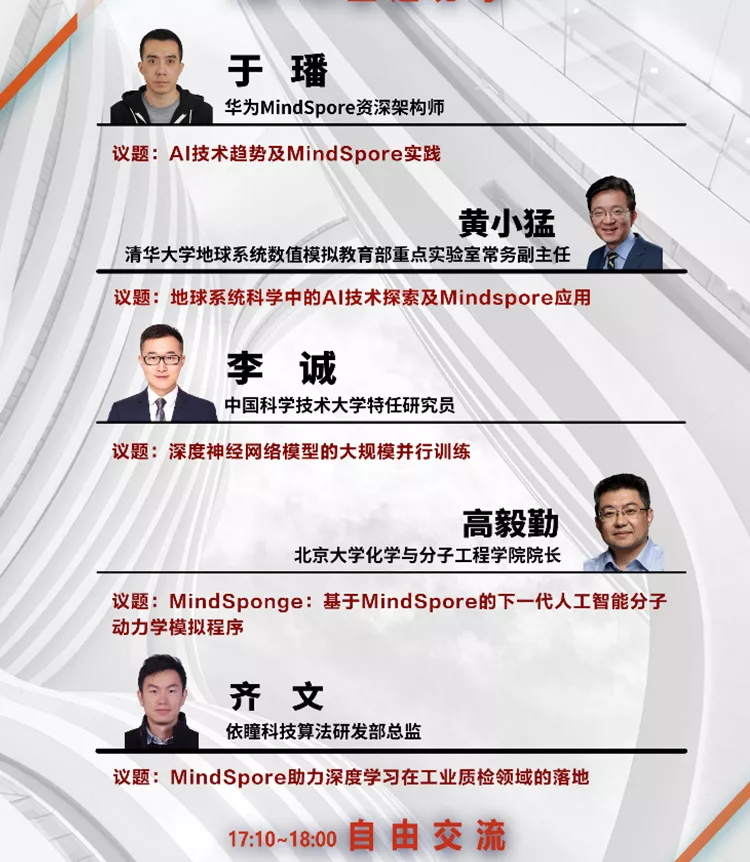 本次活动邀请了华为MindSpore资深架构师 于璠;清华大学地球系统数值模拟教育部重点实验室常务副主任 黄小猛;中国科学技术大学特任研究院 李诚;北京大学化学与分子工程学院院长 高毅勤;依瞳科技算法研发部总监 齐文;以及我们熟悉的老朋友,华为计算开源开发与运营部副总监 黄之鹏;与大家一同走进MindSpore,探讨MindSpore的技术趋势发展!