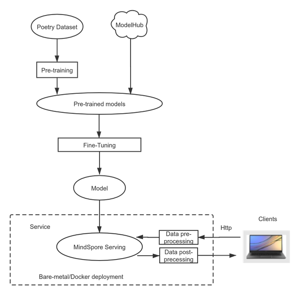 Use MindSpore to train an intelligent poem writing model and deploy the prediction service. The following flowchart shows the process: