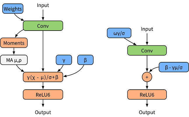 To normalize the output data, the BatchNorm operator is added after the convolutional or fully connected layer. In the training phase, the BatchNorm operator is used as an independent operator to collect statistics on the output average value and variance (as shown in the left figure in the following figure). In the inference phase, the BatchNorm operator is integrated into the weight and bias. It is called BatchNorm folding (as shown in the right figure below).