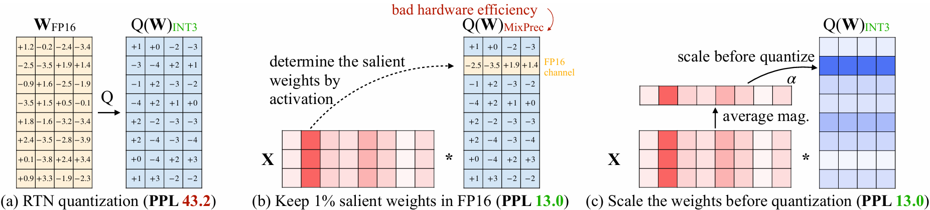 In Activation-Aware Weight Quantization, AWQ, the salient weights are selected based on the distribution of activation values, and considering the hardware efficiency, the salient weights are protected by scaling to avoid the same weight tensor from being stored by different data types, so as to realize the hardware-friendly and high-precision weighting algorithm, which can realize the quantization to 4bits or even lower bits. In addition to the protection of significant weights, AWQ also introduces dynamic weight truncation technology to further improve the accuracy of quantization.