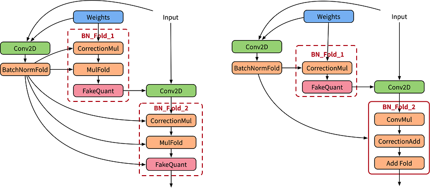 在感知量化训练中,为精确模拟推理中的折叠操作,论文[1]使用两套卷积分别用于计算当前的BatchNorm参数,并用计算得到的参数归一化实际作用卷积的权重值(如下左图),其中CorrectionMul用于权重校正,MulFold用于权重数据归一化。在MindSpore Golden Stick中会进一步将权重校正和权重数据融合(如下右图),提升训练性能。