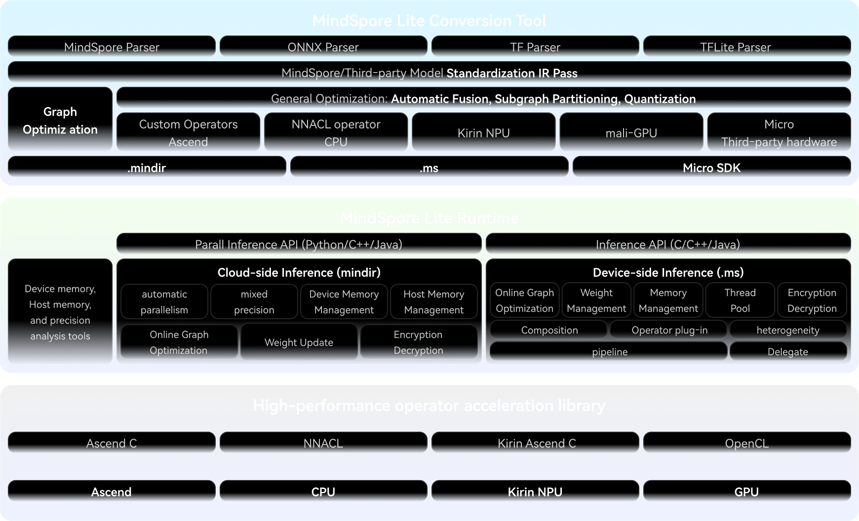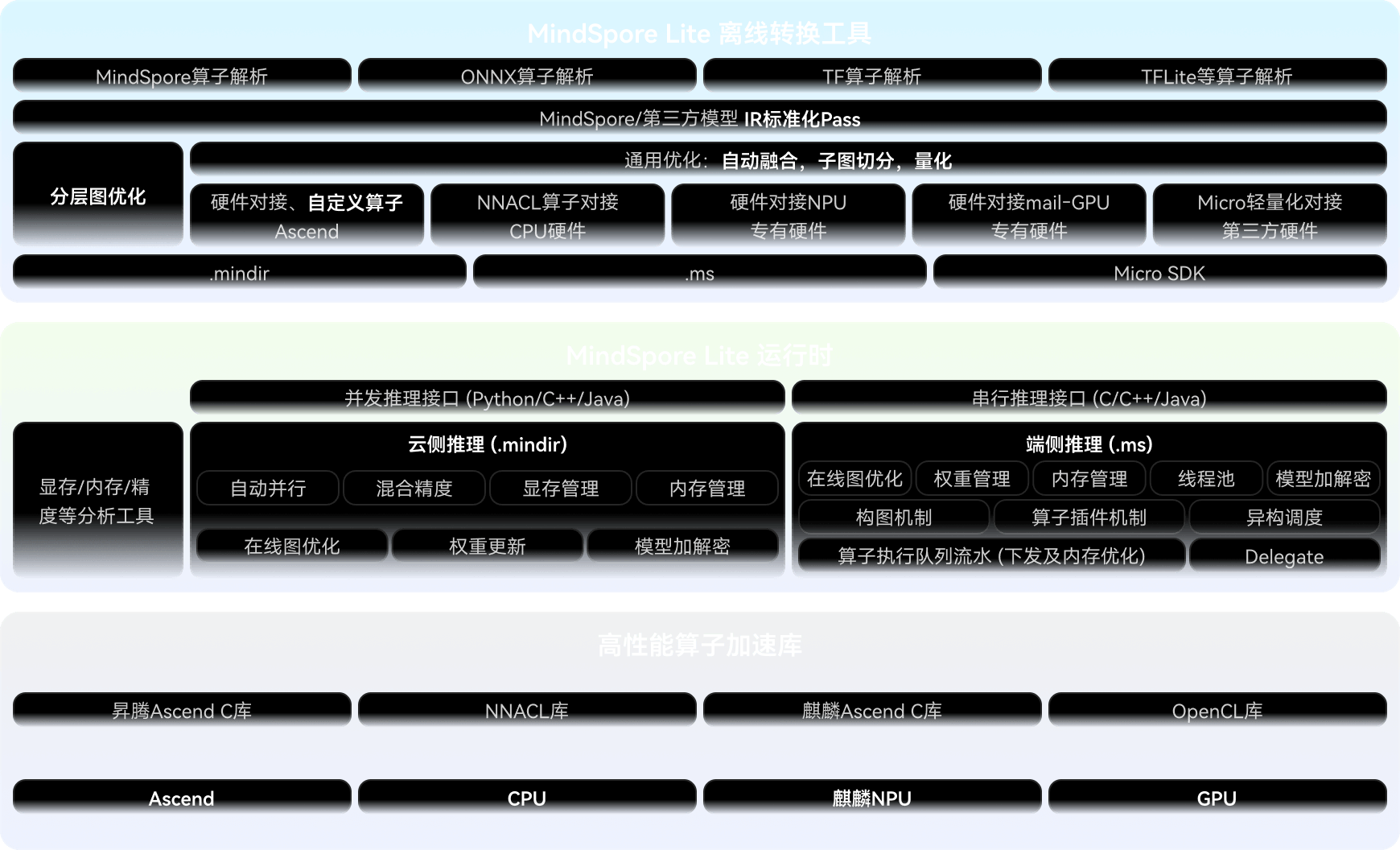 支持MindSpore/TensorFlow Lite/Caffe/Onnx模型,提供模型压缩、数据处理等能力,统一训练和推理IR,方便用户快速部署。