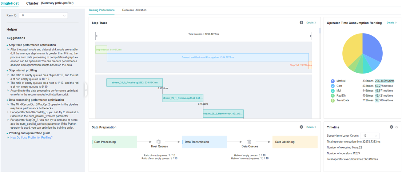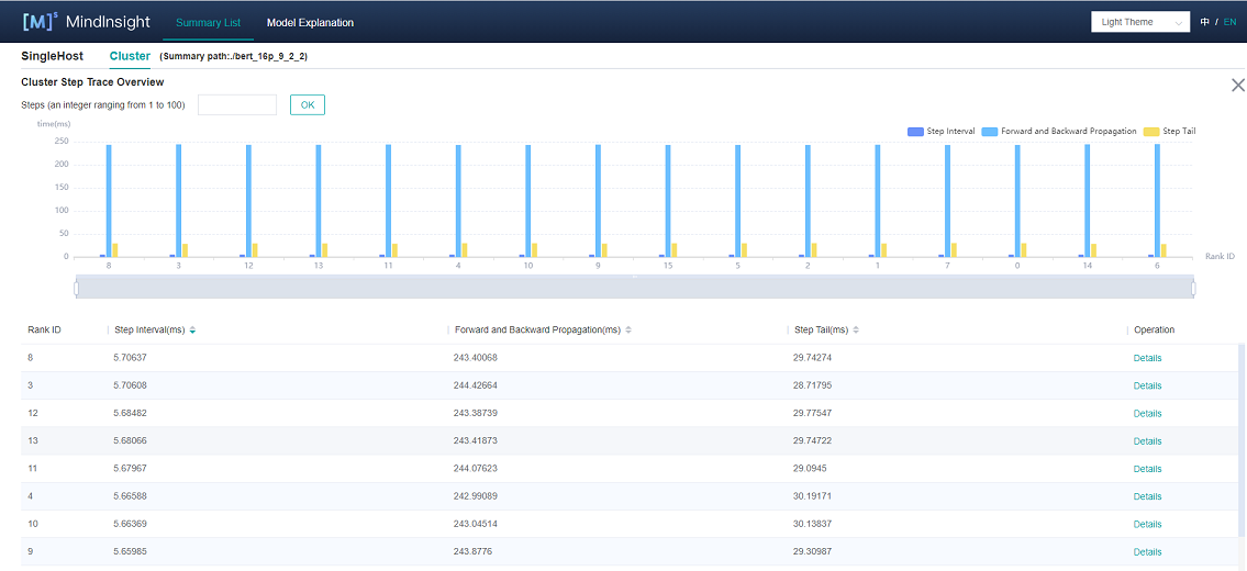 /home/user/code/data/, the summary-base-dir should be/home/user/code. After MindInsight is started, access the visualization page based on the IP address and port number. The default access IP address ishttp://127.0.0.1:8080.Find the cluster training in the list, click the cluster performance profiling link and view the data on the web page.