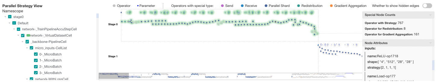 When pipeline parallel strategy is adopted, computational graphs of all stages are displayed. Each computational graph is arranged horizontally according to the correspondence of Send and Receive operators. Users can get an overall perception of the parallel execution process.