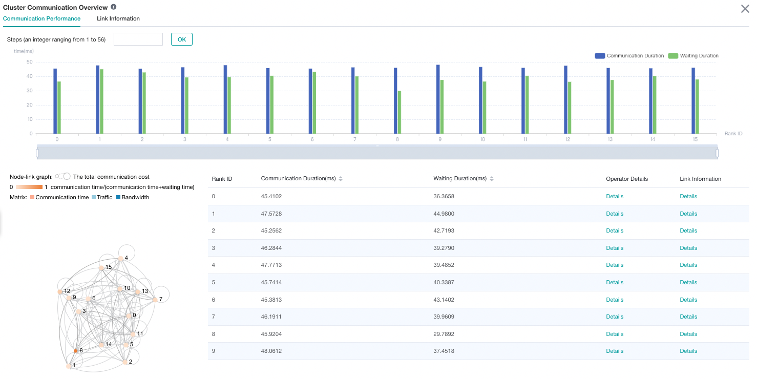 Notify waitoperators and subtracting the time consumption ofNotify waitoperator in the communication time of RDMA link.Operator details: Display the communication performance with operator granularity, including the communication duration, waiting duration and link information of the communication operator.