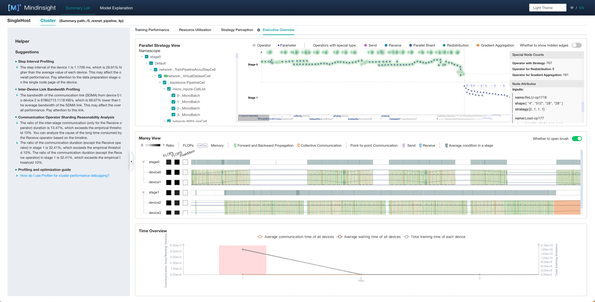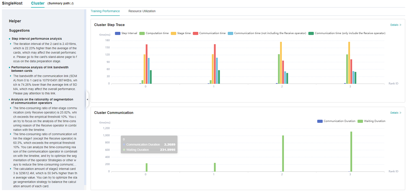 /home/user/code/data/, the summary-base-dir should be/home/user/code. After MindInsight is started, access the visualization page based on the IP address and port number. The default access IP address ishttp://127.0.0.1:8080.Find the cluster training in the list, click the cluster performance profiling link and view the data on the web page.