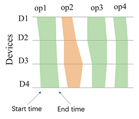 As show in Figure 22, green block represents computation operator and orange block represents communication operator. The operators executed on devices in the same pipeline stage are basically the same. Each device has a timeline. We mark the start and end time of operator execution on the timeline, then connect polygons and fill in colors. This view can help locate the following two types of problems: