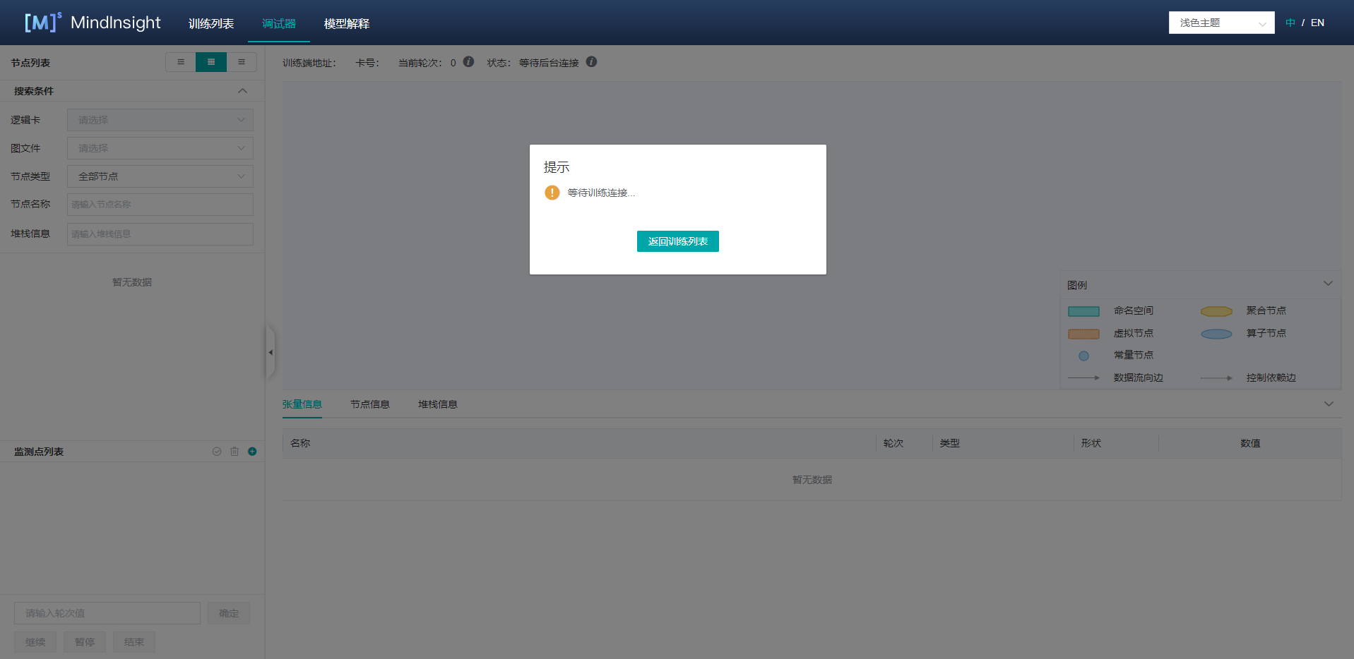 此时,调试器处于等待训练启动和连接的状态。