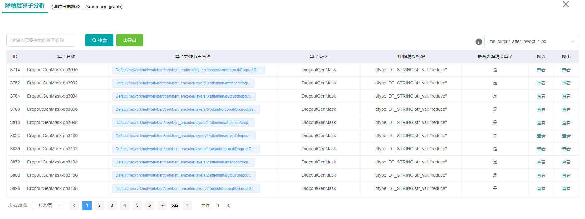 降精度算子分析模块支持一键查看当前模型所有算子信息以及是否为降精度算子,支持展示summary日志文件与通过context的save_graphs参数导出的pb文件。
