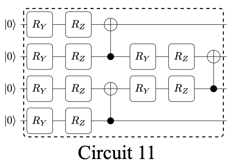 >>> from mindquantum.algorithm.nisq import Ansatz11 >>> Ansatz11(4, 1).circuit ┏━━━━━━━━┓ ┏━━━━━━━━┓ ┏━━━┓ q0: ──┨ RY(p0) ┠─┨ RZ(p4) ┠─┨╺╋╸┠──────────────────────────────── ┗━━━━━━━━┛ ┗━━━━━━━━┛ ┗━┳━┛ ┏━━━━━━━━┓ ┏━━━━━━━━┓ ┃ ┏━━━━━━━━┓ ┏━━━━━━━━━┓ ┏━━━┓ q1: ──┨ RY(p1) ┠─┨ RZ(p5) ┠───■───┨ RY(p8) ┠─┨ RZ(p10) ┠─┨╺╋╸┠─── ┗━━━━━━━━┛ ┗━━━━━━━━┛ ┗━━━━━━━━┛ ┗━━━━━━━━━┛ ┗━┳━┛ ┏━━━━━━━━┓ ┏━━━━━━━━┓ ┏━━━┓ ┏━━━━━━━━┓ ┏━━━━━━━━━┓ ┃ q2: ──┨ RY(p2) ┠─┨ RZ(p6) ┠─┨╺╋╸┠─┨ RY(p9) ┠─┨ RZ(p11) ┠───■───── ┗━━━━━━━━┛ ┗━━━━━━━━┛ ┗━┳━┛ ┗━━━━━━━━┛ ┗━━━━━━━━━┛ ┏━━━━━━━━┓ ┏━━━━━━━━┓ ┃ q3: ──┨ RY(p3) ┠─┨ RZ(p7) ┠───■────────────────────────────────── ┗━━━━━━━━┛ ┗━━━━━━━━┛