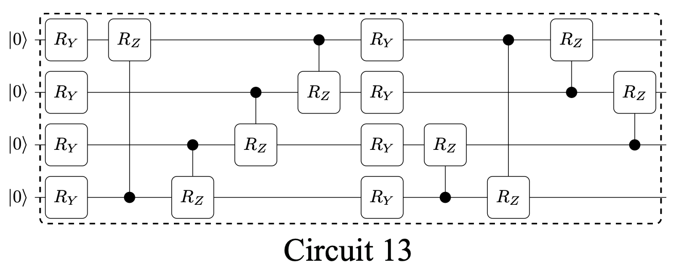 >>> from mindquantum.algorithm.nisq import Ansatz13 >>> Ansatz13(4, 1).circuit ┏━━━━━━━━┓ ┏━━━━━━━━┓ ┏━━━━━━━━┓ q0: ──┨ RY(p0) ┠─┨ RZ(p4) ┠────────────────────────────■─────┨ RY(p8) ┠──────────────↯─ ┗━━━━━━━━┛ ┗━━━━┳━━━┛ ┃ ┗━━━━━━━━┛ ┏━━━━━━━━┓ ┃ ┏━━━━┻━━━┓ ┏━━━━━━━━┓ q1: ──┨ RY(p1) ┠──────╂─────────────────────■─────┨ RZ(p7) ┠─┨ RY(p9) ┠──────────────↯─ ┗━━━━━━━━┛ ┃ ┃ ┗━━━━━━━━┛ ┗━━━━━━━━┛ ┏━━━━━━━━┓ ┃ ┏━━━━┻━━━┓ ┏━━━━━━━━━┓ ┏━━━━━━━━━┓ q2: ──┨ RY(p2) ┠──────╂──────────■─────┨ RZ(p6) ┠────────────┨ RY(p10) ┠─┨ RZ(p12) ┠─↯─ ┗━━━━━━━━┛ ┃ ┃ ┗━━━━━━━━┛ ┗━━━━━━━━━┛ ┗━━━━┳━━━━┛ ┏━━━━━━━━┓ ┃ ┏━━━━┻━━━┓ ┏━━━━━━━━━┓ ┃ q3: ──┨ RY(p3) ┠──────■─────┨ RZ(p5) ┠───────────────────────┨ RY(p11) ┠──────■──────↯─ ┗━━━━━━━━┛ ┗━━━━━━━━┛ ┗━━━━━━━━━┛ ┏━━━━━━━━━┓ q0: ───────■──────┨ RZ(p14) ┠─────────────── ┃ ┗━━━━┳━━━━┛ ┃ ┃ ┏━━━━━━━━━┓ q1: ───────╂───────────■──────┨ RZ(p15) ┠─── ┃ ┗━━━━┳━━━━┛ ┃ ┃ q2: ───────╂───────────────────────■──────── ┃ ┏━━━━┻━━━━┓ q3: ──┨ RZ(p13) ┠─────────────────────────── ┗━━━━━━━━━┛