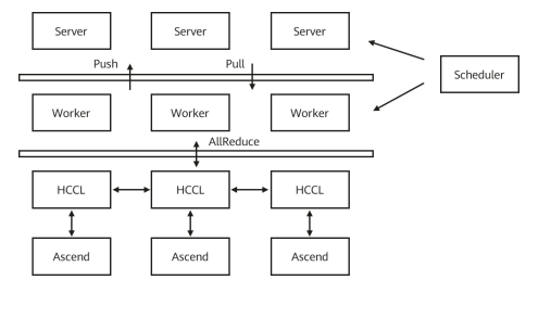 Furthermore, with the high-performance collective communication libraries in Ascend and GPUs, that is, Huawei Collective Communication Library (HCCL) and NVIDIA Collective Communications Library (NCCL), MindSpore also provides the hybrid training mode of Parameter Server and AllReduce. Some weights can be stored and updated through Parameter Server, and others are trained using the AllReduce algorithm.