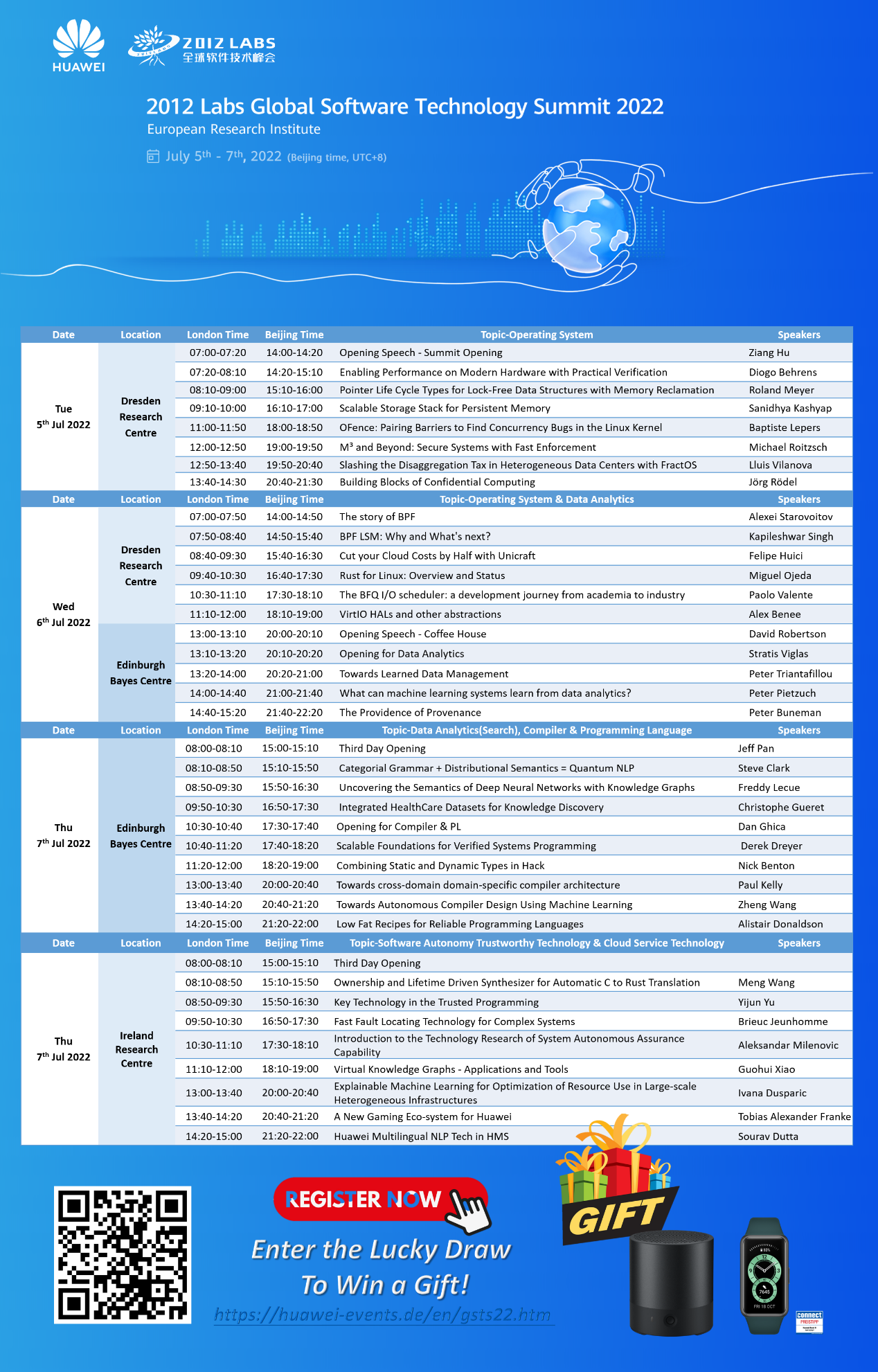 For the European Session, Huawei European Research Institute and Central Software Institute together invite collaboration partners and the research community to join the three-day open access conference focusing on the latest research and development in Operating Systems, Data Analytics, Compiler, Programming Language, Software Autonomy Trustworthy Technology & Cloud Service Technology and related topics – innovations which will build the future mission-critical systems.