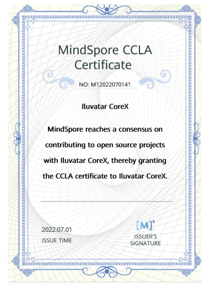 With the granted Corporate Contributor License Agreement (CCLA), Iluvatar CoreX is now a member of the MindSpore community.