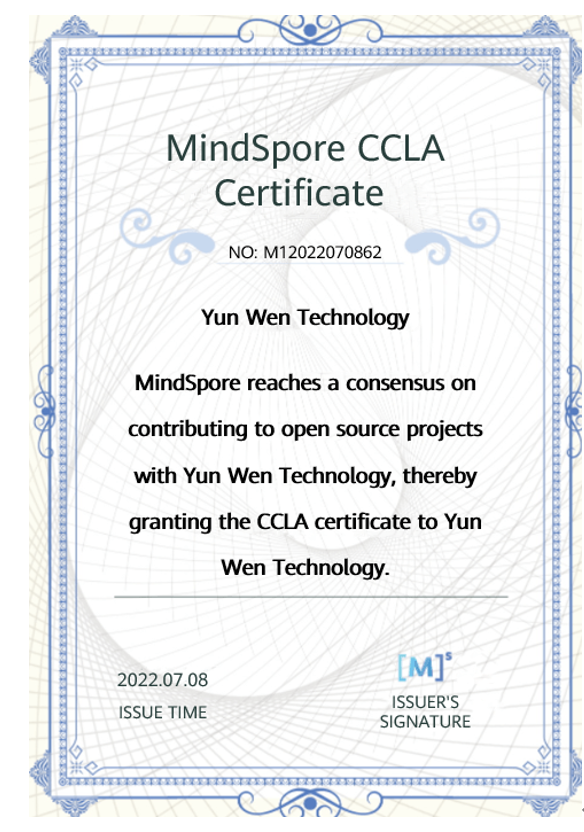 Yun Wen Technology signed the Corporate Contributor License Agreement (CCLA) and has become a new member to the MindSpore open source community.