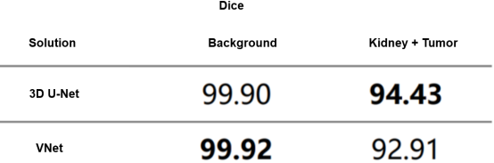 In actual training, we used VNet[7] as a comparison algorithm to compare with 3D U-Net, and Table 1 lists the comparison result. VNet is slightly better than 3D U-Net in background segmentation, but 3D U-Net outperforms VNet in kidney-tumor segmentation. This discrepancy could be attributed to the fact that VNet's residual structures are not effectively leveraged due to the simplistic medical image content. Additionally, discrepancies in the features of the tumor and kidney may have contributed to VNet's increased tendency for misjudgment. In a nutshell, the performance of 3D U-Net is better than that of the VNet. That's why we chose 3D U-Net for kidney-tumor segmentation in the first phase.