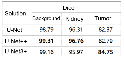We compared the prediction results of U-Net, U-Net++[8], and U-Net3+[9] in our experiment, and the following table shows the result. According to the data in the table, due to the multi-scale information fusion, U-Net3+'s result of tumor prediction is significantly higher than those of the other two. Therefore, we finally used U-Net3+ to segment kidney and tumor regions.