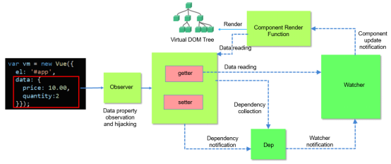 The Vue reactivity refers to that the view is driven by data. That is, when data changes, the view is re-rendered. The following three points need to be considered during the implementation of this process: