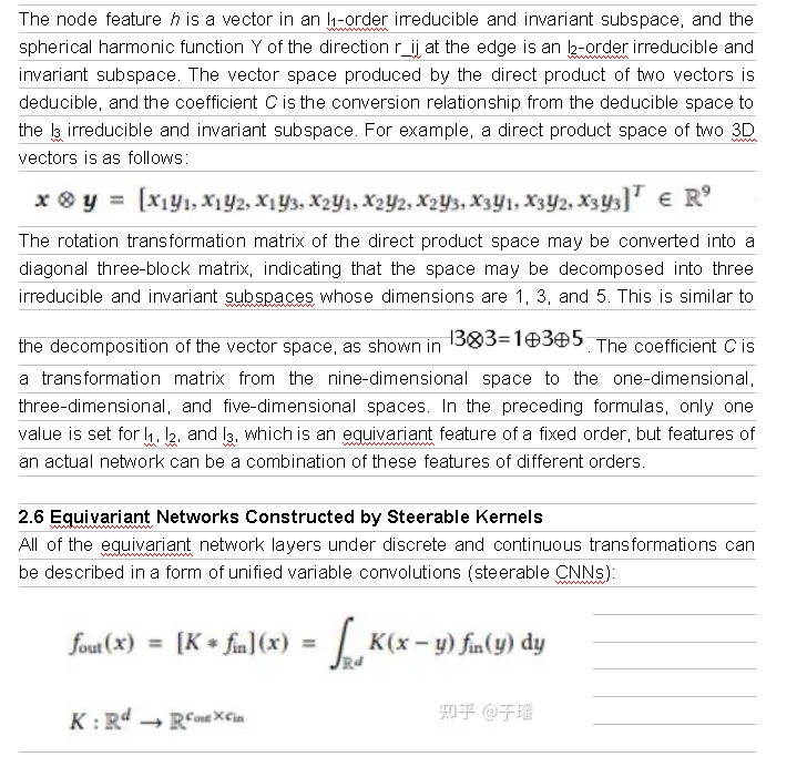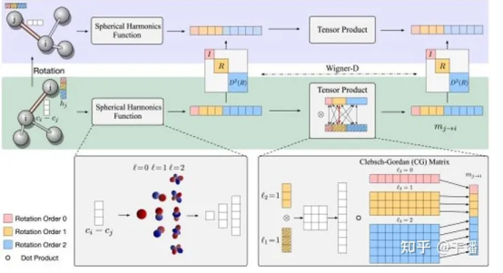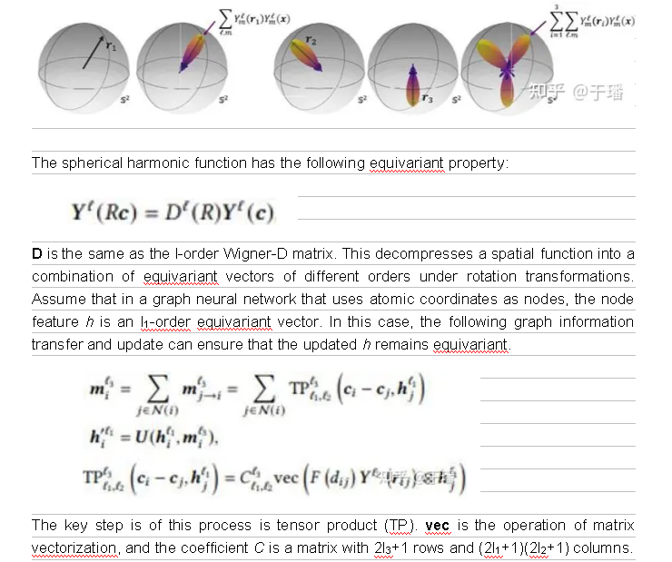 For many scientific problems, we focus on continuous transformations in a 3D space, for instance, translations and rotations of chemical compounds. Accordingly, vectors formed by predicted molecular properties also rotate. These consecutive rotations R and translations t form elements in SE(3) (SE stands for the special Euclidean group in a 3D space), and these transformations can be represented as transformation matrices in vector spaces. Transformation matrices in different vector spaces may be different, but all these vector spaces can be decomposed into mutually independent subvector spaces. Each subspace has a same transformation rule, that is, vectors generated after all transformation elements in the group are applied to vectors in the subspace still exist in this subspace. Therefore, transformation elements in the group can be represented by an irreducible transformation matrix in the subspace. For example, scalars such as total energy and band gaps remain unchanged under actions of elements in SE(3), and the transformation matrix is represented as D^0(R)=1. However, the force field rotates with the transformation matrix being represented as D^1(R)=R. In a higher-dimensional vector space, D^l(R) represents a (2l+1)-dimensional array. These transformation matrices D^l(R) are referred to as l-order Wigner-D matrix of R, and corresponding subvector spaces become l-order irreducible and unchanged subspaces of SE(3), where vectors are referred to as l-order equivariant vectors. In translations, these vectors always remain unchanged, because their properties are only associated with relative positions.