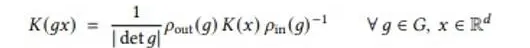g is the transformation in a spatial transformation group, and ρ_in and ρ_out are representations (transformation matrices) of the transformation in input and output feature spaces, respectively.