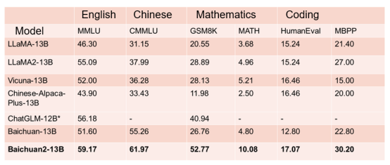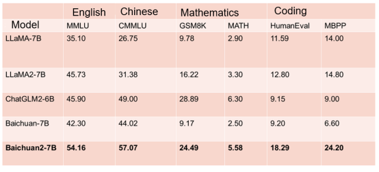 Notably, Baichuan2-7B, with seven billion parameters, performs on par with LLaMA 2, which has 13 billion parameters, in mainstream English tasks according to multiple authoritative benchmarks such as MMLU.