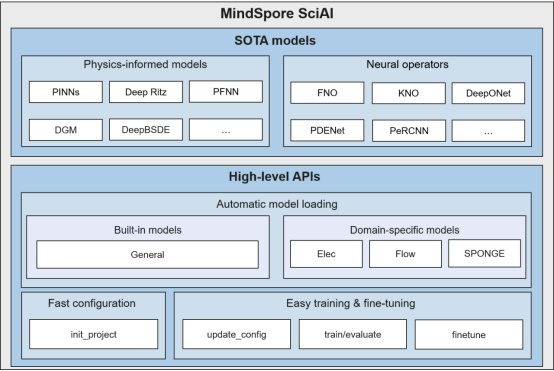 MindSpore SciAI is an AI for science model library that supports a wide range of models. Its 0.1 version integrates 60+ SOTA models, covering both physics-informed models like PINNs and PFNN and neural operators like FNO and KNO. The library also delivers OOTB APIs for automatic model loading, fast environment configuration, and easy training and fine-tuning.