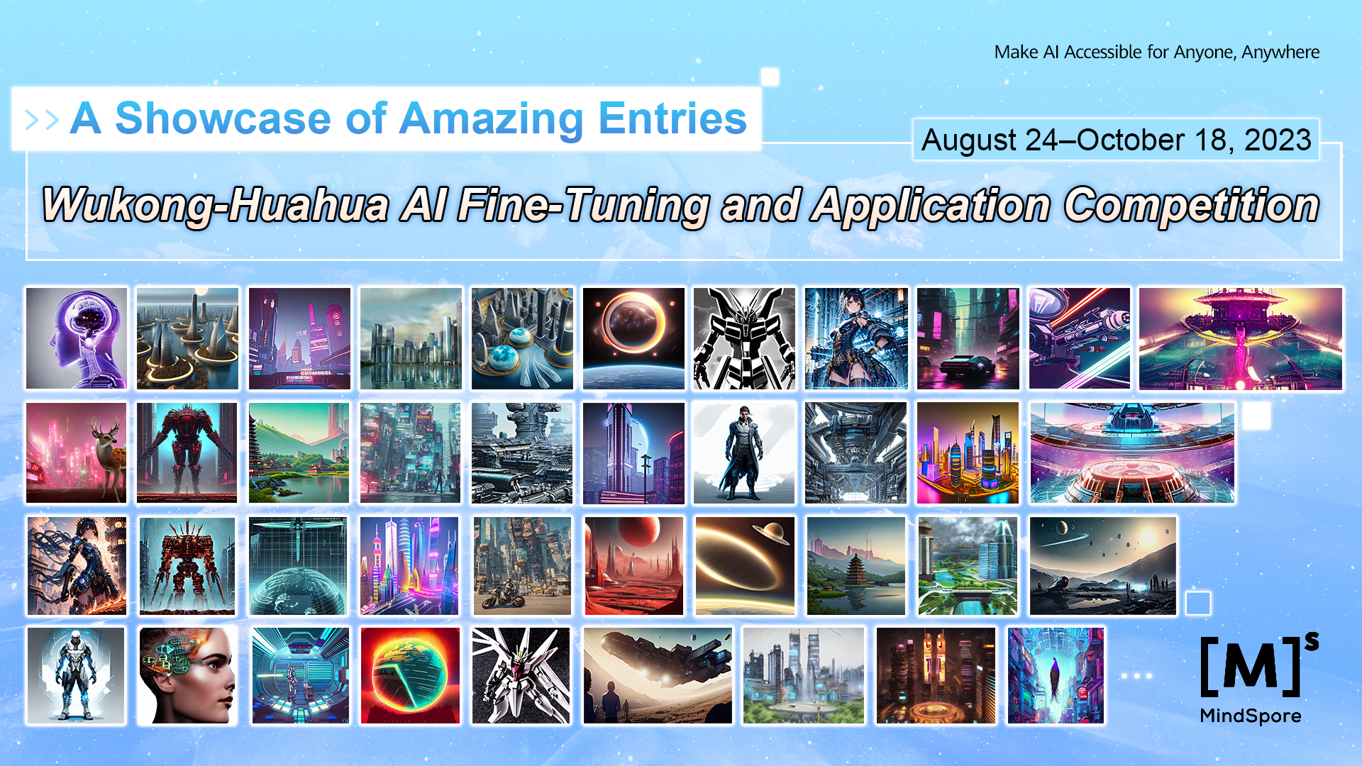 To unleash AI imagination, the MindSpore community also hosted the Wukong-Huahua AI Fine-Tuning and Application Competition from August 24 to October 18 in 2023. Wukong-Huahua is a diffusion model-based LLM, powered by MindSpore, that boasts excellent AI image generation capabilities together with powerful graphics. Participating teams could develop innovative apps based on the model API or deliver remarkable AI drawings after fine-tuning the model. We received a total of 263 entries for this competition and 31 entries, including LoRA/DreamBooth fine-tuned models and applications, entered the defense stage. Let's celebrate the impressive works of our participants, who have shown their incredible imagination in the competition.