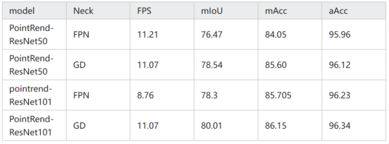 Necks in PointRend are replaced with GD, and training and testing are performed on the Cityscapes datasets.