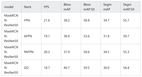 Necks in Mask R-CNN are replaced with GD, and training and testing are performed on the COCO instance datasets.
