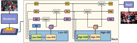 To address the challenges, Huawei proposes the GD mechanism for information exchange and fusion. This mechanism implements efficient information exchange and fusion by globally fusing multi-level features and injecting the obtained global information into higher levels. This greatly enhances the information fusion capability of the neck without significantly increasing the latency, thereby improving the model's detection capability on varying object sizes.
