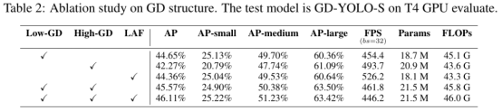 At the same time, an ablation experiment is performed, considering the impacts on model accuracy and speed caused by the different branches and structures of Gold-YOLO.