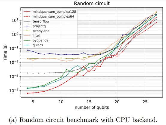 The white paper compares the performance of MindSpore Quantum with other quantum computing frameworks, highlighting its significant advantages in random quantum circuit simulation tasks.