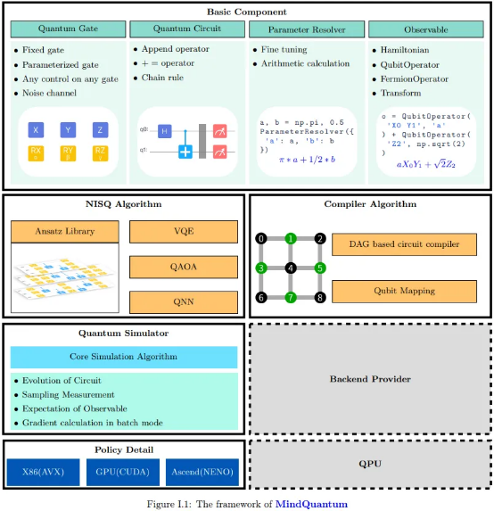 ● Provides multiple tools, such as gradient of variational quantum algorithm (VQA), circuit Ansatz library, and quantum algorithm subroutine.