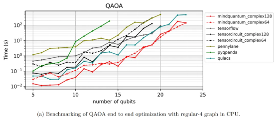 In addition, the performance of each framework in QAOA tasks is also tested. The results show that the performance of MindSpore Quantum is at least one order of magnitude faster than that other frameworks. This is mainly due to the in-depth optimization of MindSpore Quantum in gradient calculation of parameterized quantum circuit and efficient implementation of circuit evolution.