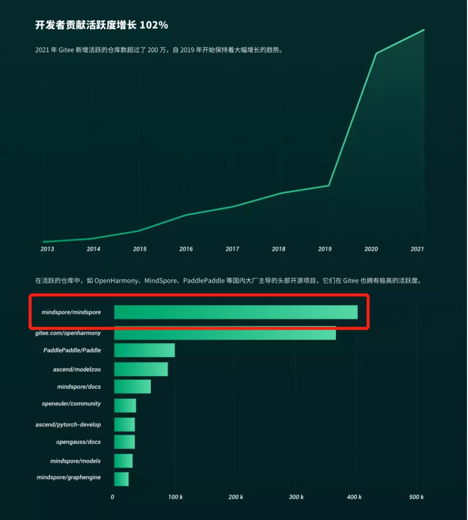 数据显示,2021年Gitee新增活跃的仓库数超过了200万,自2019年开始保持着大幅增长的趋势,总开发者贡献活跃度增长102%。在活跃的仓库中,如OpenHarmony、MindSpore、PaddlePaddle等国内大厂主导的头部开源项目具有极高的活跃度,而MindSpore的活跃度则排在了第一。