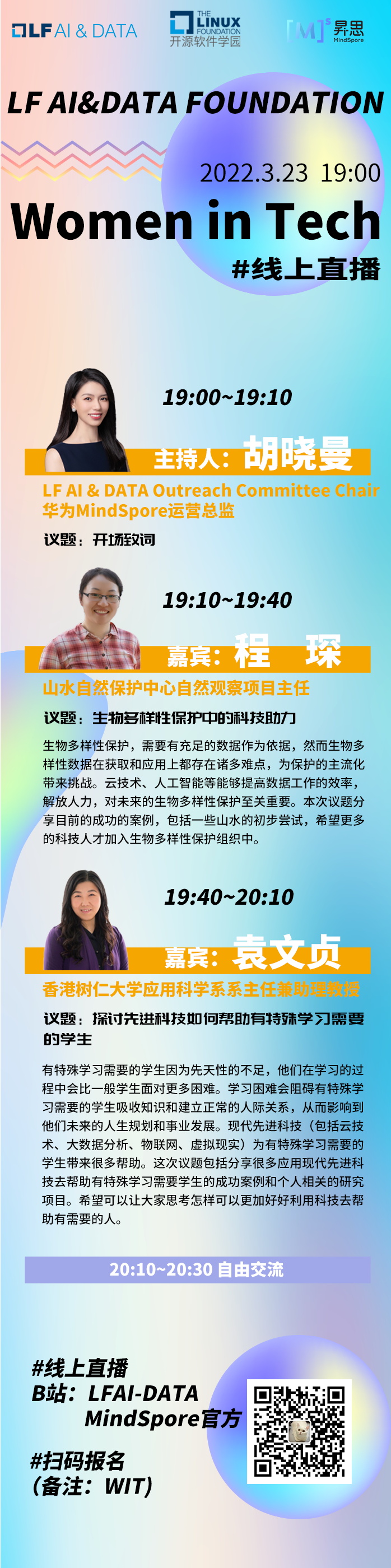 3月23日19:00,由LF AI&DATA基金会主办,昇思MindSpore开源社区和LF开源软件学园协办的Women In Tech活动,为大家邀请了两位重量级女性嘉宾,分享当前科技对生物多样性,与特殊学习需要的学生保护的成功案例,希望更多的科技女性、科技人才加入保护特殊动物与人群的行列中来,用科技的力量改变世界。