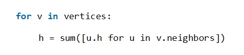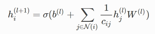 表示第层卷积计算后节点的特征向量,由其邻近节点的特征经过线性变换后求合,然后进行非线性转换得到。一个最为自然的Python写法是: