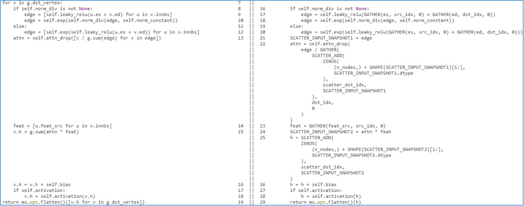 为了方便用户对生成的代码进行检查,我们还提供精确到行的代码转换对照。利用此工具,我们将GAT模型的核心代码转换展示在下图: