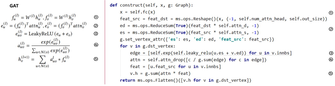 GAT的公式如左图所示,u和v代表了边(u,v)的起点和终点。我们可以看到在我们的GNN框架下可以最大程度上做到了对左侧公式的一一对应。