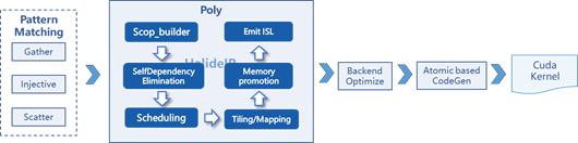 因此MindSpore 增加识别了新的算子融合模式GIS,将一个或多个Gather算子,Injective算子,Scatter算子融合成一个算子。算子融合之后,在AKG(自动算子生成)算子编译层面,通过polyhedral技术进行自动的算子优化和生成,包含进行特征自适应线程组合并行,节点并行加速计算,以及采用动态Scheduling进行负载均衡,该方案流程如下: