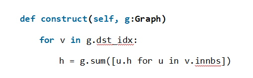 其中v为中心节点,调用v.innbs获取它的邻居节点列表,然后通过g.sum进行求和聚合。可以清楚的看到,这种表达方式最大程度的贴合了用户的思考习惯和使用习惯,使得编写GNN模型像编写普通Python程序一样简单。我们再以GAT模型为例,进一步展示我们的编程模型: