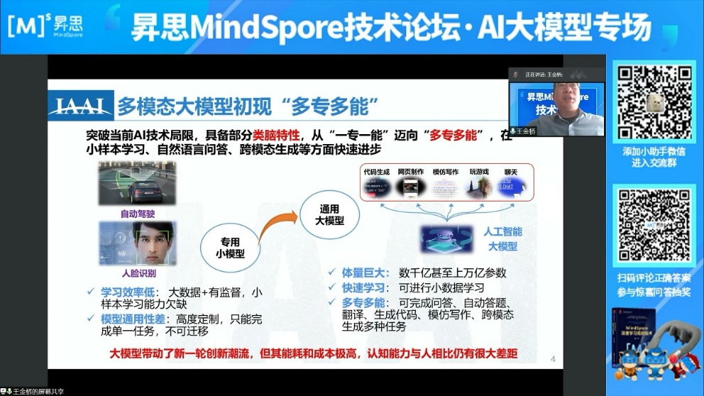 4月9日,昇思MindSpore联合知名媒体Paperweekly举办了昇思MindSpore技术论坛第一期·AI大模型专场,邀请了中科院、武汉大学、北京大学等院校专家学者,以及昇思MindSpore技术专家共论AI大模型对科研及产业所带来的新的技术突破及价值。