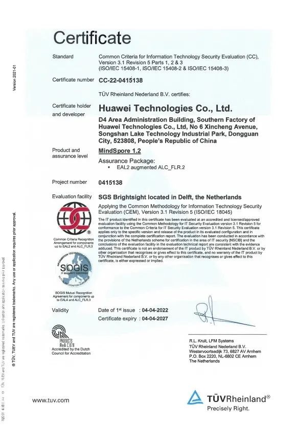 此次为昇思MindSpore进行测评的是荷兰政府指定的权威产品信息安全测评实验室SGS Brightsight,是全球最大的独立认证机构,也是受国际广泛认可的安全实验室之一。