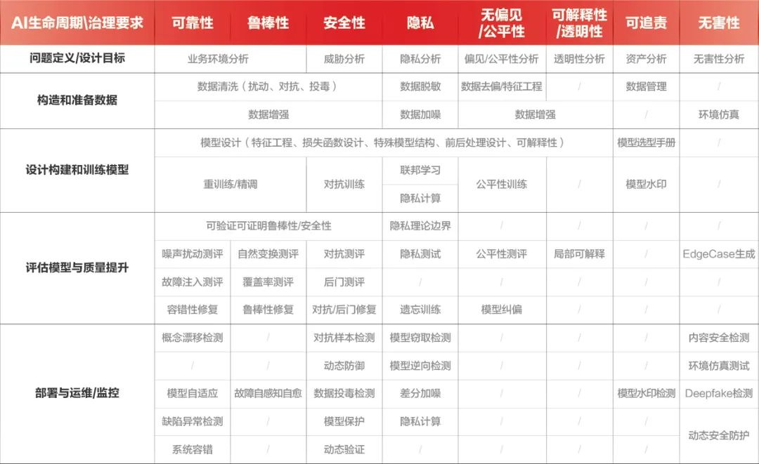 当前,监管机构、学术界等对可信AI的内涵和外延展开了充分的探讨。我们观察到,在AI生命周期中,主要包含如下可信AI的技术: